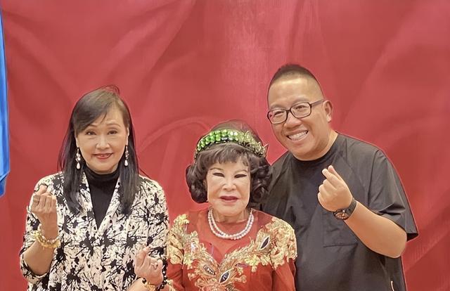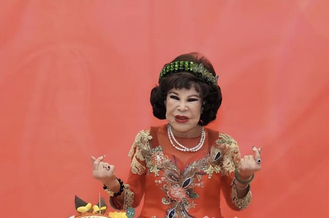 寿宴当日,黄夏蕙身着绣有牡丹与凤尾的红色长裙,佩戴皇冠头饰及蓝宝石钻戒,整体形象喜庆隆重。